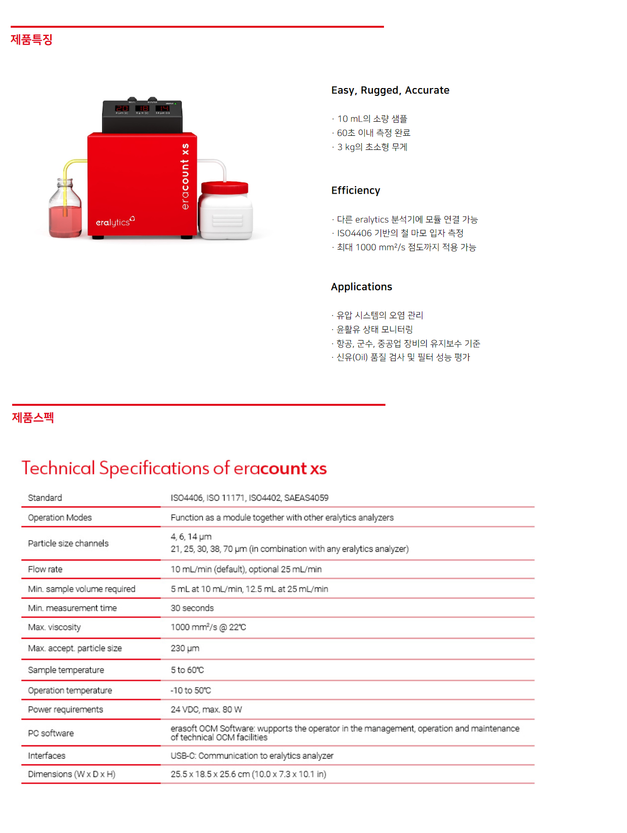 Eralytics사의 eracount XS 제품은 윤활의 등의 오염 입자 측정기로