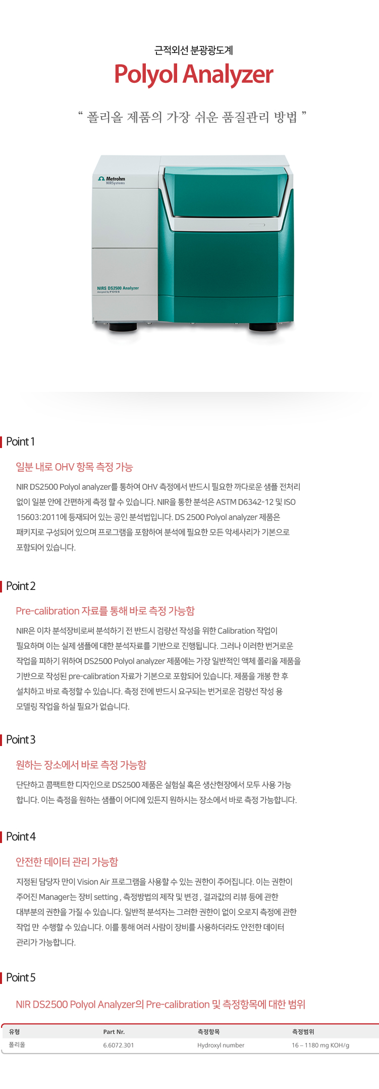 NIR DS 2500 Polyol Analyzer를 통해 폴리올(Polyol) 제품을 가장 쉽고, 간편하게 품질관리 할 수 있습니다. OHV (hydroxyl value) 측정에서 반드시 필요한 까다로운 샘플 전처리 없이 일 분안에 간편하게 측정할 수 있습니다. NIR을 통한 분석은 ASTM D6342-12 및 ISO 15603:2011에 등재되어 있는 공인 분석법입니다. DS 2500 Polyol Analyzer 제품은 패키지로 구성되어 있으며, 프로그램을 포함하여 분석에 필요한 모든 악세사리가 기본으로 포함되어 있습니다.