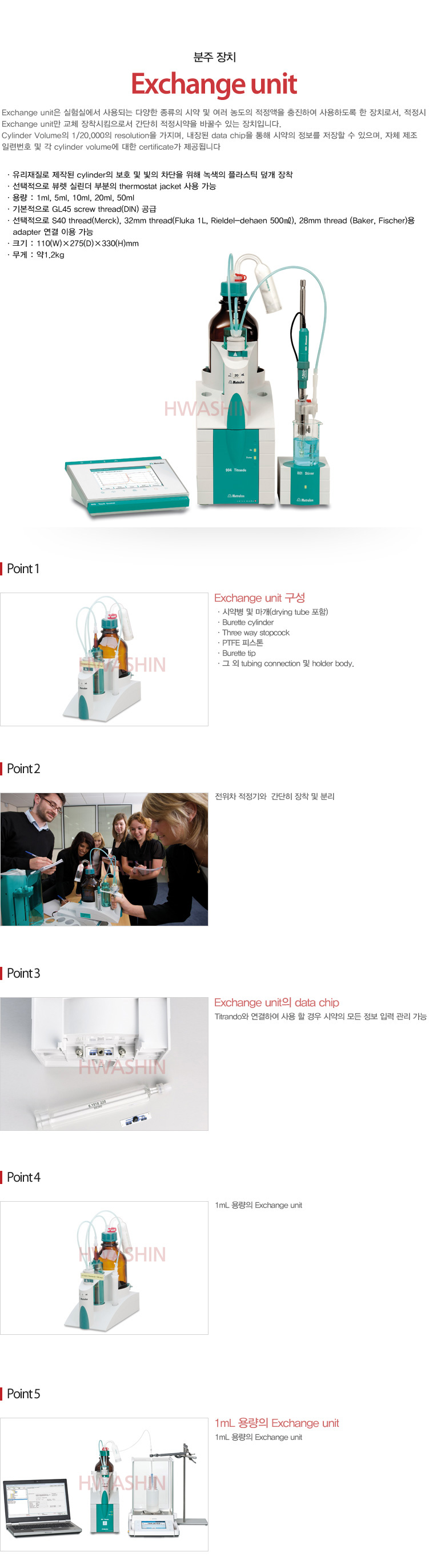 [전위차적정기] [Metrohm] 806 Exchange unit Exchange unit은 실험실에서 사용되는 다양한 종류의 시약 및 여러 농도의 적정액을 충진하여 사용하도록 한 장치로서, 적정시 Exchange unit만 교체 장착시킴으로서 간단히 적정시약을 바꿀수 있는 장치입니다. 카달로그 및 제품 문의는 아래 메일로 연락을 주시기 바랍니다. 고객센터 : 1644-2519 info@hwashinbs.com 이전글 [Metrohm] 864 Robotic Balance Sample Processor 다음글 [Metrohm] Tiamo software 목록 본문 이전글 [Metrohm] 864 Robotic Balance Sample Processor 다음글 [Metrohm] Tiamo software 목록