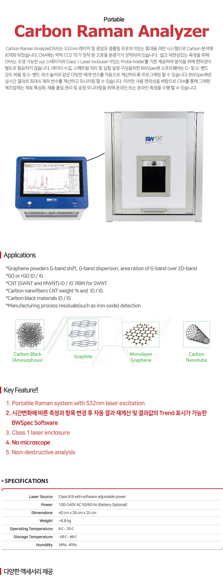 Carbon Raman Analyzer(CRA) 는 532nm 레이저 및 광섬유 샘플링 프로브가 있는 휴대용 라만 시스템으로 Carbon 분석에 최적화 되었습니다. CRA는 박막 CCD TE가 장착된 고효율 분광기가 장착되어 있습니다. 쉽고 재현성 있는 측정을 위해 CRA는 조정 가능한 xyz 스테이지와 Class 1 Laser enclouser가 있는 Probe holder를 기본 제공하며 분석을 위해 현미경이 별도로 필요하지 않습니다. 데이터 수집, 스펙트럼 처리 및 실험 성정 구성을 위한 BWSpec 소프트웨어는 D- 및 G- 밴드 강도 비율 및 G- 밴드 피크 높이와 같은 다양한 매개 변수를 자동을 계산할도록 프로그래밍 할 수 있습니다. BWSpec 소프트웨어은 실시간 결과로 최대 6개의 변수를 계산하고 모니터링 할 수 있습니다. 이러한 사용 편의성을 바탕으로 CRA를 통해 그래핀 제조업체는 재료 특성화 , 제품 품질 관리 및 공정 모니터링을 위해 온라인 측정을 수행 할 수 있습니다.