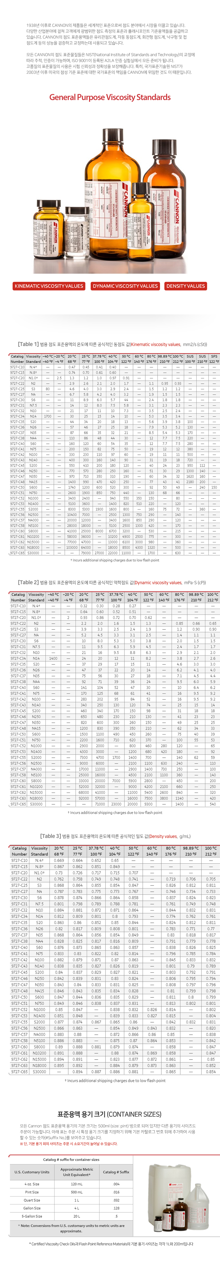 CANNON사는 ASTM D445/446 및 ISO 3104/3105의 정밀한 규격에 따르는 점도 표준용액들을 공급하고 있습니다. 다양한 목적의 표준용액들을 사이즈별로 제공합니다. 각각의 Lot별 규격데이터를 함께 보내드립니다.