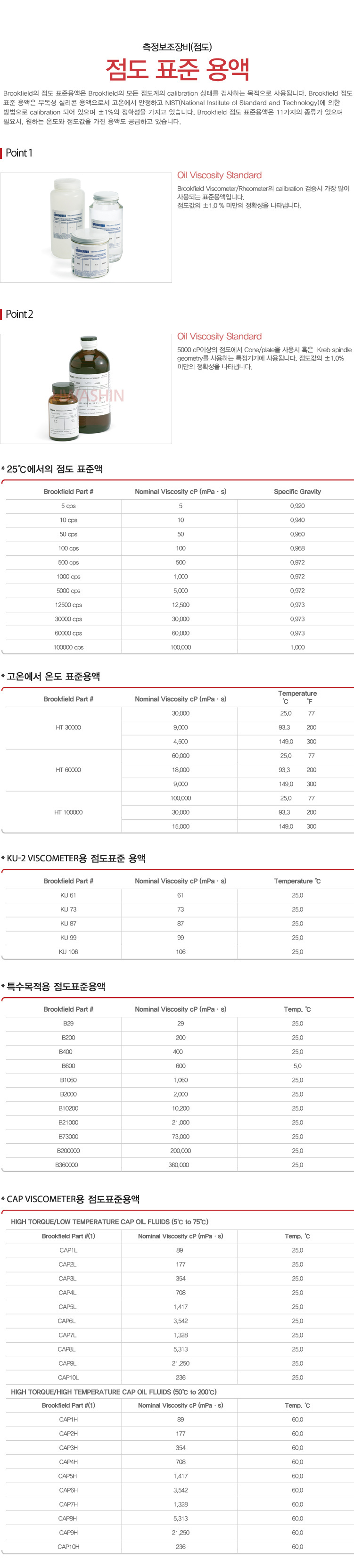 Brookfield Ametek의 점도 표준 용액은 Brookfield Ametek의 모든 점도계의 calibration 상태를 검사하는 목적으로 사용됩니다. Brookfield 점도 표준 용액은 무독성 실리콘 용액으로서 고온에서 안정하고 NIST (National Institute of Standard and Technology)에 의한 방법으로 calibration 되어 있으며 ± 1%의 정확성을 가지고 있습니다. Brookfield Ametek 점도 표준액은 11가지의 종류가 있으며 필요시, 원하는 온도와 점도값을 가진 용액도 공급하고 있습니다.
