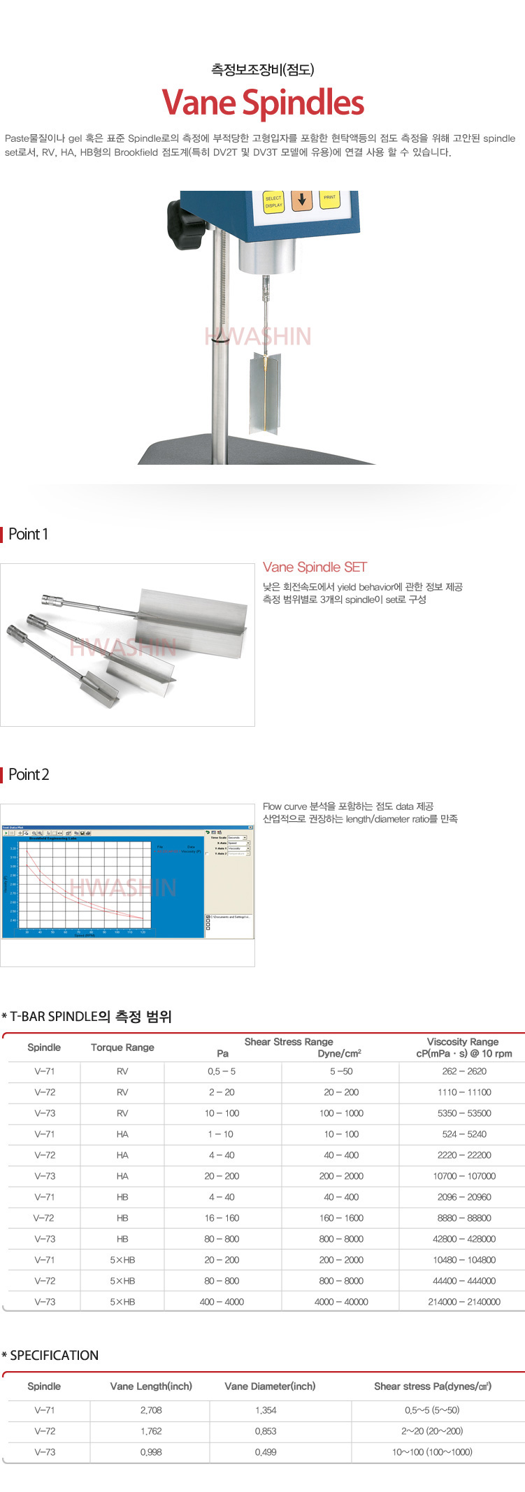 Paste 물질이나 gel 혹은 표준 Spindle로의 측정에 부적당한 고형입자를 포함한 현탁액 등의 점도 측정을 위한 고안된 spindle로서, RV/HA/HB형의 Brookfield Ametek 점도계 (특히 DV2T 및 DVNX 모델에 유용)과 함계 사용 할 수 있습니다.