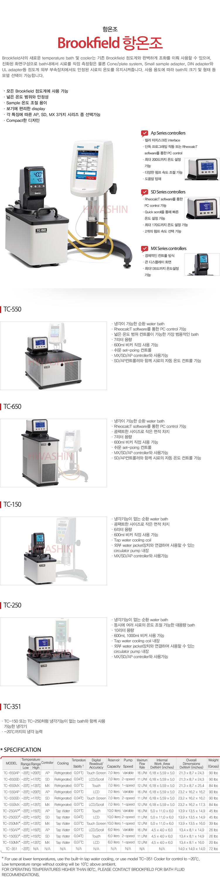 Brookfield Ametek 사의 새로운 temperature bath는 기존 Bookfield Ametek 점도계와 완벽하게 조화를 이뤄 사용할 수 있으며, 진화된 화면구성으로 bath 내에서 시료를 직접 측정함은 물론 Cone/plate system, Small sample adapter, DIN adapter와 UL adapter 등 점도계 외부 부속장치에서도 안정된 시료의 온도를 유지시켜줍니다. 사용 용도에 따라 bath의 크기 및 형태 등 모델 선택이 가능합니다.