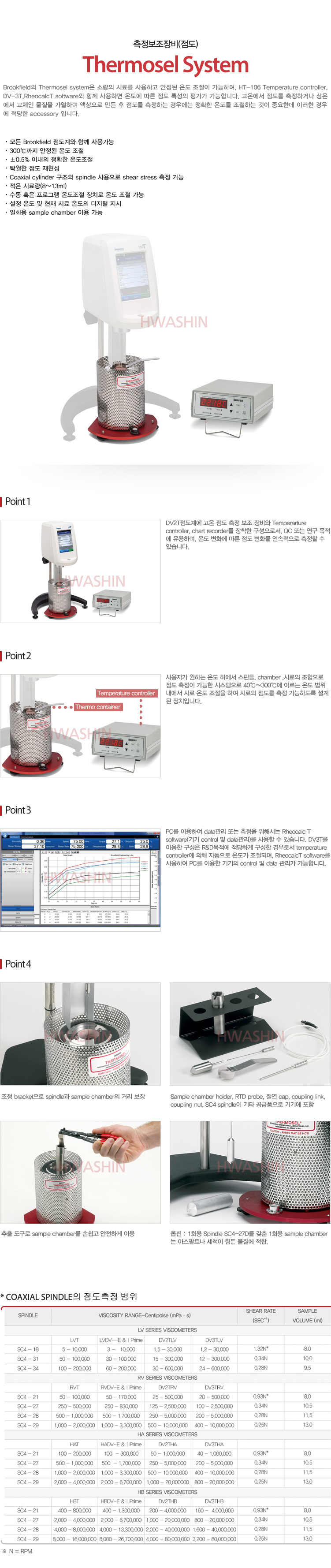 Brookfield Ametek 사의 Thermosel system은 소량의 시료를 사용하며 안정된 온도 조절이 가능합니다. DV2T or DVNX / RheocalcT software와 함께 사용하면 온도에 따른 점도 특성의 평가가 가능합니다. 고온에서 점도를 측정하거나 상온에서 고체인 물질을 가열하여 액상으로 만든 후 점도를 측정하는 경우에는 정환한 온도를 조절하는 것이 중요한데 이러한 경우에 적당한 accessory 입니다.