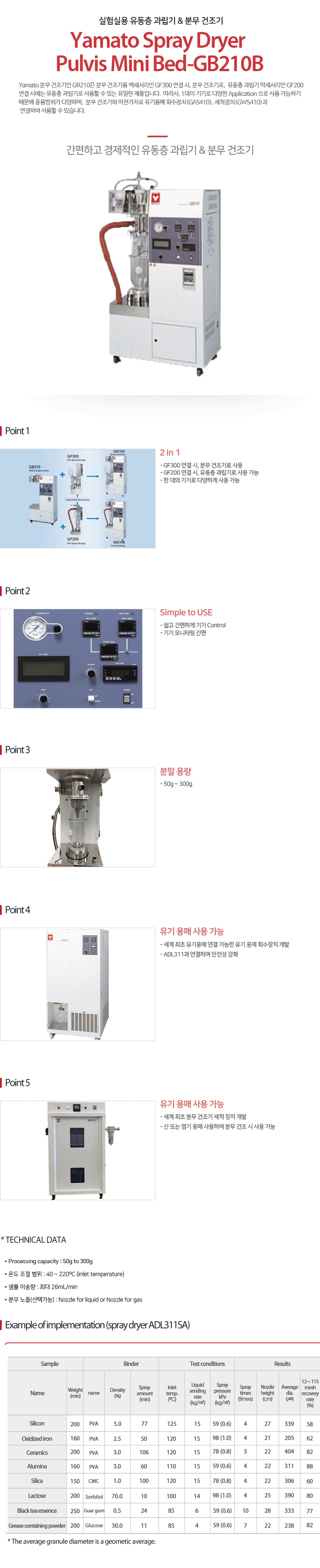 [분무건조기] [Yamato]Spray Dryer-GB210 A & B GB-210 기기에 GF200 을 연결하여 열풍으로 건조시키면서 샘플을 분사합니다. 건조와 동시에 코팅 과정을 할 수 있는 유동층 과립기를 소개합니다. 메이커 : Yamato 카달로그 및 제품 문의는 아래 메일로 연락을 주시기 바랍니다. 고객센터 : 1644-2519 info@hwashinbs.com 이전글 [Yamato]Spray Dryer-ADL311SA 다음글 [Yamato]대용량 Spray Dryer-DL410 목록 본문 이전글 [Yamato]Spray Dryer-ADL311SA 다음글 [Yamato]대용량 Spray Dryer-DL410 목록