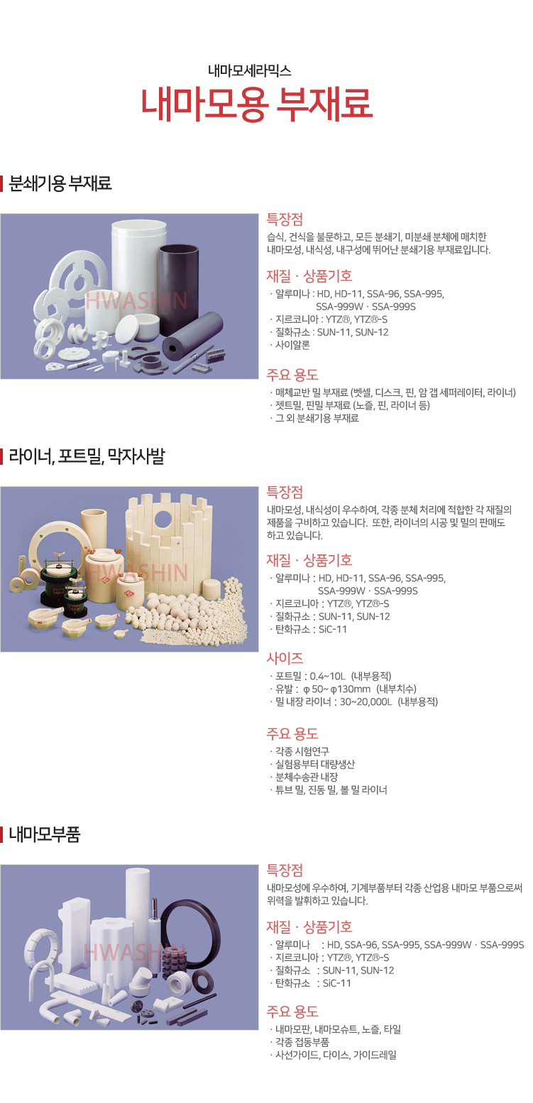 [세라믹제품] 분쇄기용 부재료, 라이너, 포트밀, 막자사발, 내마모부품 세라믹, 분쇄기용, 부재료, 미분세, 분체, 라이너, 포트밀, 막자사발, 내마모부품, 내마모성, 내식성 메이커 : NIKKATO 카달로그 및 제품 문의는 아래 메일로 연락을 주시기 바랍니다. 고객센터 : 1644-2519 info@hwashinbs.com 이전글 볼밀 다음글 세라믹스 튜브, 보호관ㆍ절연관ㆍ미세관 목록 본문 이전글 볼밀 다음글 세라믹스 튜브, 보호관ㆍ절연관ㆍ미세관 목록