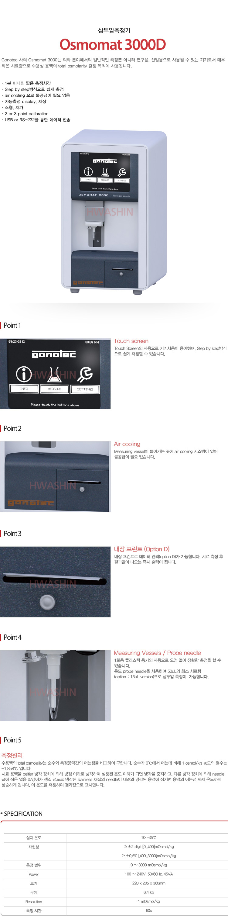 [삼투압측정기] Osmomat 3000D Medical 분야를 중점으로 하여 개발된 장비로서 수용성 용액의 삼투압을 측정하는 장비 입니다. 50uL의 적은 시료량으로 빠르게 측정 가능한 장점을 가지고 있습니다. 메이커 : Gonotec 카달로그 및 제품 문의는 아래 메일로 연락을 주시기 바랍니다. 고객센터 : 1644-2519 info@hwashinbs.com 이전글 Model F 다음글 Osmomat Auto 목록 본문 이전글 Model F 다음글 Osmomat Auto 목록