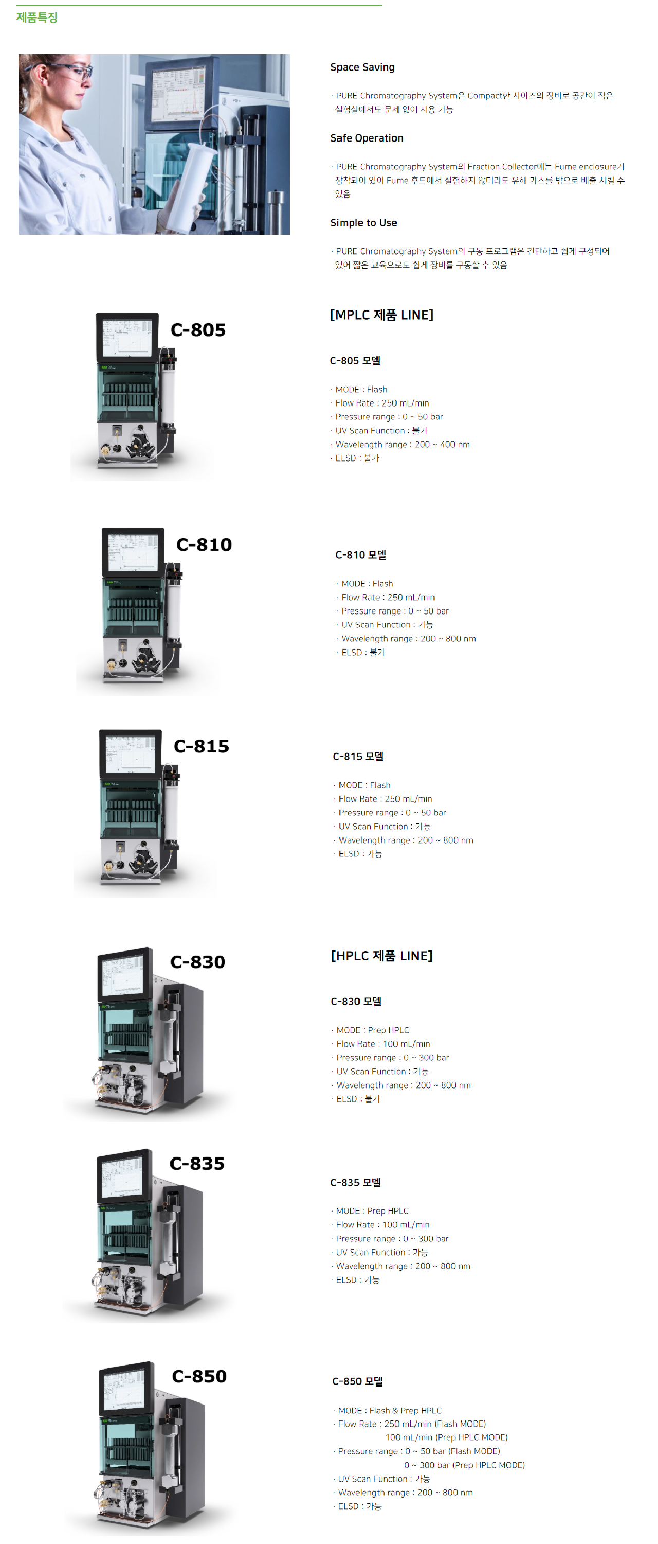 BUCHI사는 Medium Pressure로 물질을 분리하는 MPLC 라인의 모델과