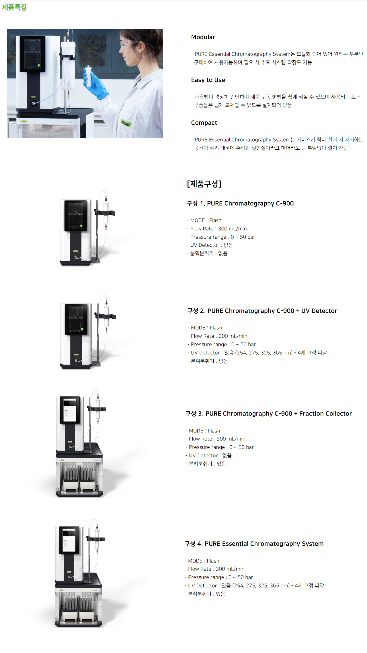PURE Essential Chromatography System은 비용 효율적인 분취용 크로마토그래피 장비로 모듈화 되어 있어