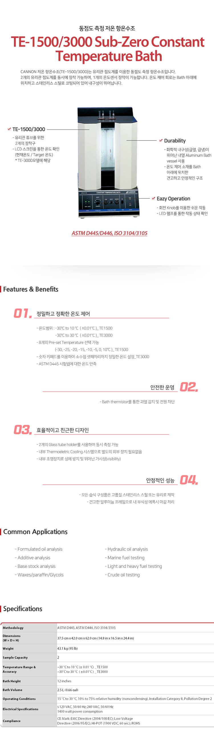 Cannon사의 TE-1500,3000 모델은 동점도 측정을 위한 저온 항온수조로 2개 유리관 점도계의 동시 장착이 가능합니다. ASTM D445/D446, ISO 3104/3105 For Kinematic Viscosity From -30℃ ~ 30℃