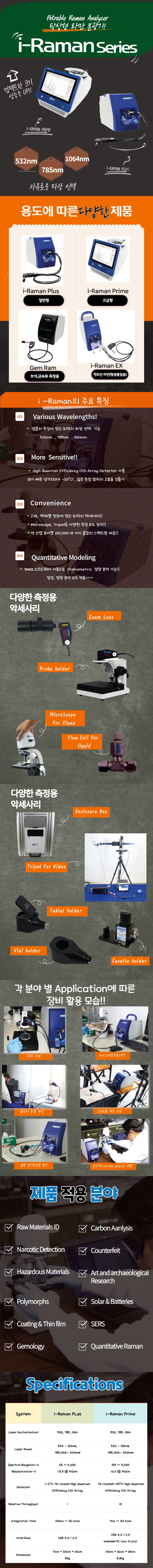 Portable Raman Analyzer 제품군은 전 산업분야에서 다양한 시료의 라만 스펙트럼을 연구하거나 Hand-held 타입의 라만분광기처럼 물질 식별용으로 사용가능한 다목적 라만 분광기입니다.