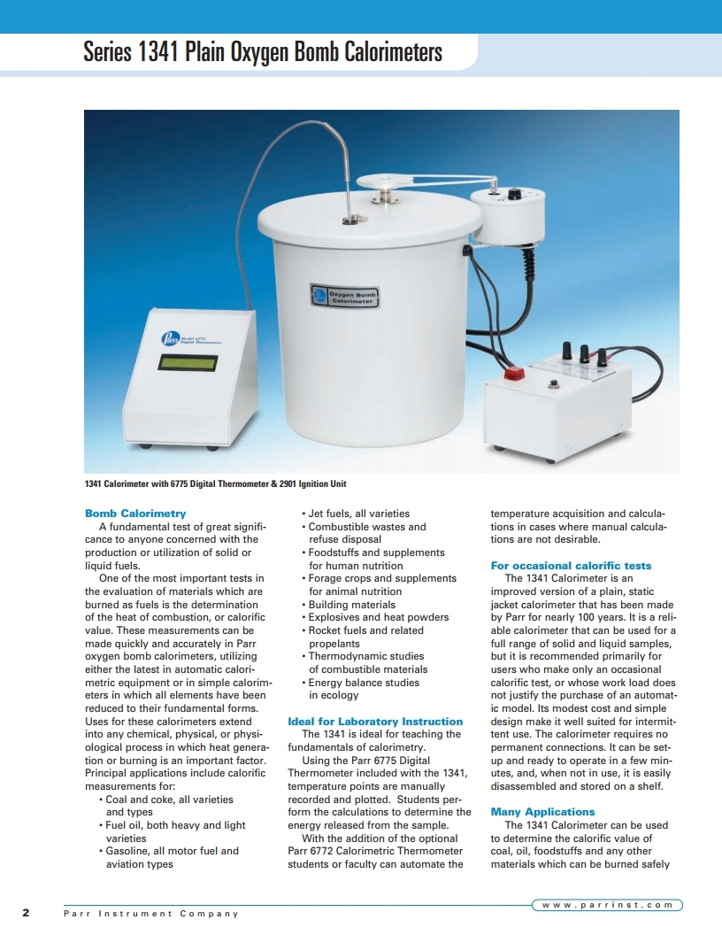 Parr사에 100년 이상 된 가장 기본적인 방식의 열량계. 고체, 액체 등 모든 시료 적용 가능 하며,