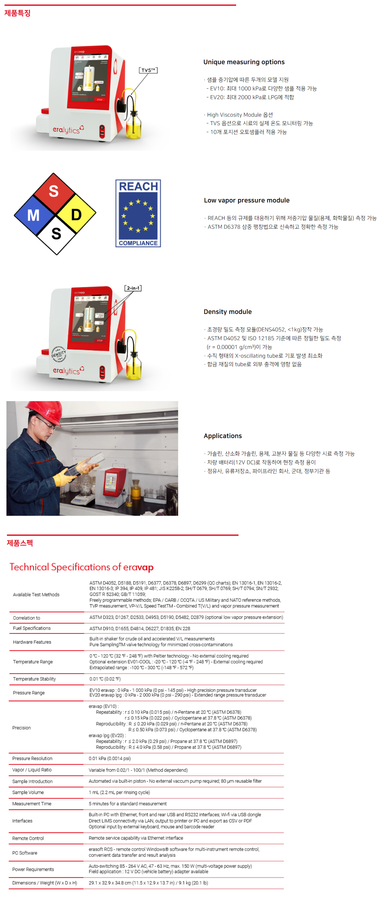Eralytics사의 eravap 제품은 가솔린, 항공유, 원유, LPG, 유기/수용성 용매 등의 증기압 측정에 사용되며,