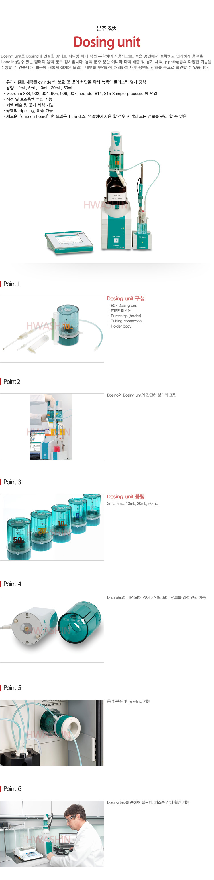 [전위차적정기] [Metrohm] 800 Dosinge unit Dosing unit은 Dosino에 연결한 상태로 시약병 위에 직접 부착하여 사용되므로, 적은 공간에서 정확하고 편리하게 용액을 Handling할수 있는 형태의 용액 분주 장치입니다. 카달로그 및 제품 문의는 아래 메일로 연락을 주시기 바랍니다. 고객센터 : 1644-2519 info@hwashinbs.com 이전글 [Metrohm] 803 Ti stand & 801 Magnetic & 802 Propeller Stirrer 다음글 [Metrohm] 864 Robotic Balance Sample Processor 목록 본문 이전글 [Metrohm] 803 Ti stand & 801 Magnetic & 802 Propeller Stirrer 다음글 [Metrohm] 864 Robotic Balance Sample Processor 목록