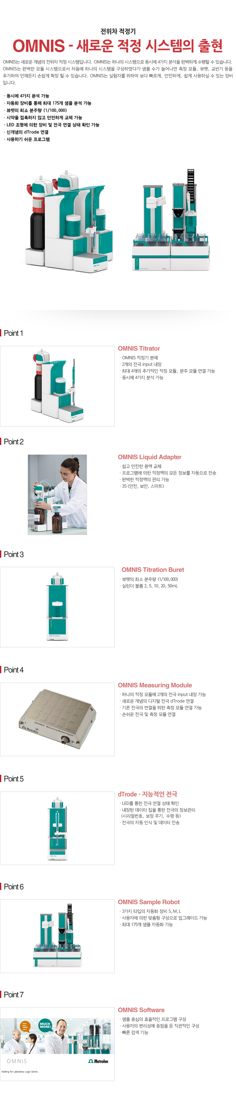 OMNIS는 새로운 개념의 전위차 적정 시스템으로, 하나의 시스템으로 동시에 4가지 분석을 완벽하게 수행할 수 있습니다. OMNIS는 완벽한 모듈 시스템으로서 처음에 하나의 시스템을 구성하였다가 샘플 수가 늘어나면 측정 모듈, 뷰렛, 교반기 등을 추가할 수 있습니다.