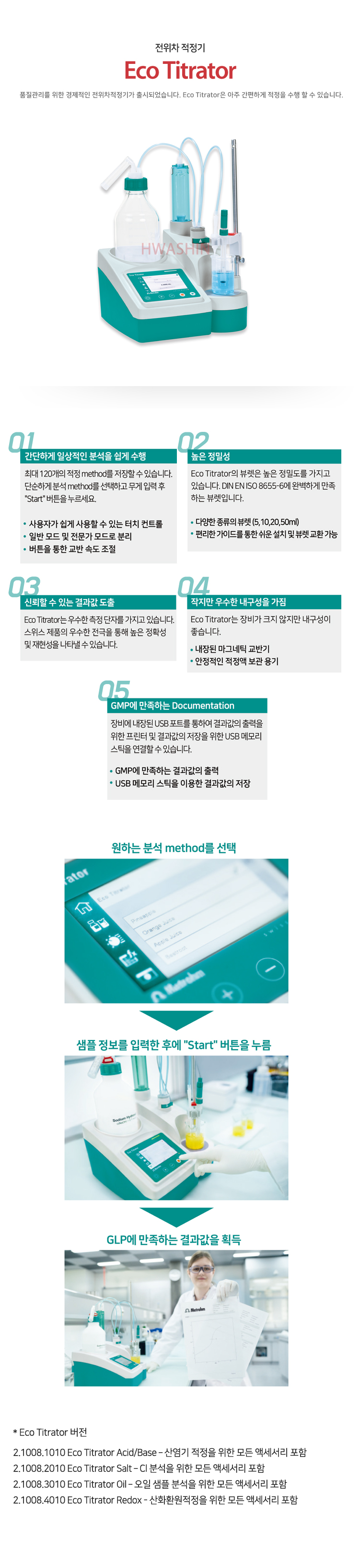 [전위차적정기] [Metrohm] Eco Titrator 품질관리를 위한 경제적인 전위차적정기가 출시되었습니다. Eco Titrator은 아주 간편하게 적정을 수행 할 수 있습니다 카달로그 및 제품 문의는 아래 메일로 연락을 주시기 바랍니다. 고객센터 : 1644-2519 info@hwashinbs.com 이전글 [Metrohm] OMNIS 자동화장비(전위차적정기) 다음글 [Metrohm] OMNIS System 목록 본문 이전글 [Metrohm] OMNIS 자동화장비(전위차적정기) 다음글 [Metrohm] OMNIS System 목록