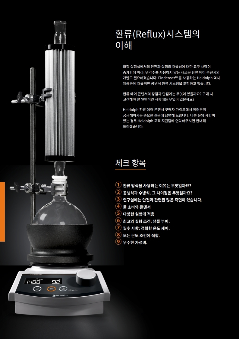 화학 실험실에서의 안전과 실험의 효율성에 대한 요구 사항이 증가함에 따라, 냉각수를 사용하지 않는 새로운 환류 에어 콘덴서의 개발도 필요해졌습니다. FindenserTM 를 사용하는 Heidolph 역시 제품군에 효율적인 공냉식 환류 시스템을 포함하고 있습니다