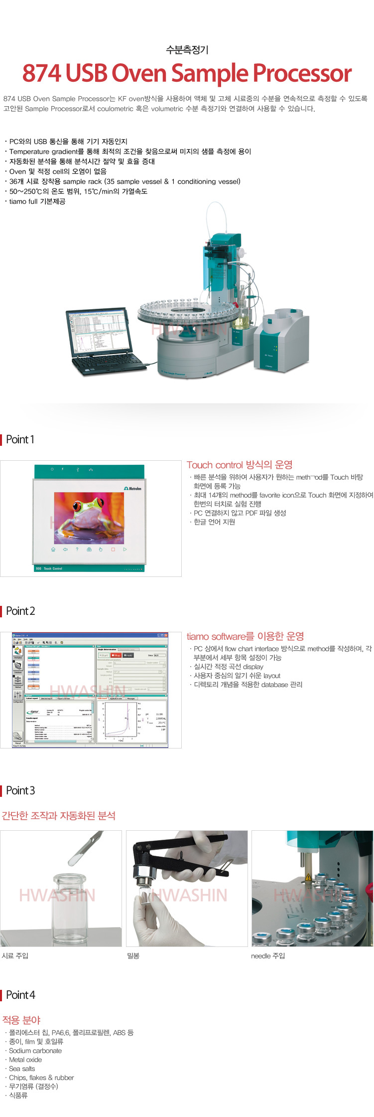 874 USB Oven Sample Processor는 KF oven방식을 사용하여 액체 및 고체 시료중의 수분을 35개를 연속적으로 측정할 수 있도록 고안된 Sample Processor로서 coulometric 혹은 volumetric 수분 측정기와 연결하여 사용할 수 있습니다.