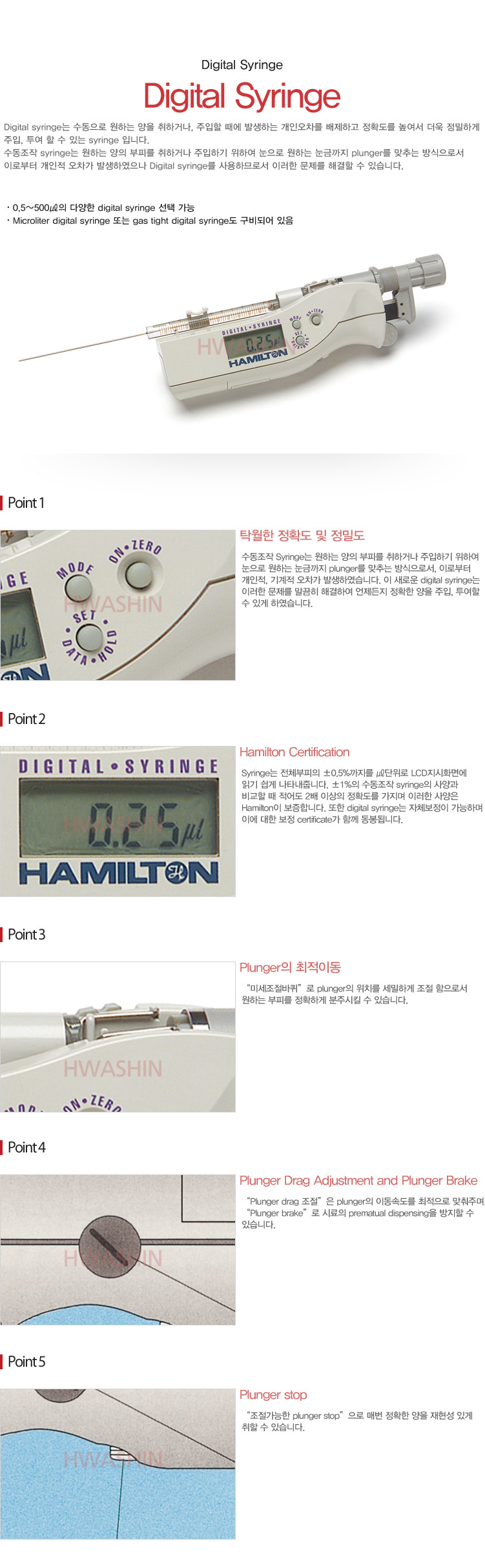 [마이크로실린지] Hamilton Digital Syringe Digital syringe는 수동으로 원하는 양을 취하거나, 주입할 때에 발생하는 개인오차를 배제하고 정확도를 높여서 더욱 정밀하게 주입, 투여 할 수 있는 syringe 입니다. 메이커 : Hamilton 카달로그 및 제품 문의는 아래 메일로 연락을 주시기 바랍니다. 고객센터 : 1644-2519 info@hwashinbs.com 이전글 Hamilton Gastight Syringe 다음글 Hamilton Syringe Cleaner 검색 목록 본문 이전글 Hamilton Gastight Syringe 다음글 Hamilton Syringe Cleaner 검색 목록