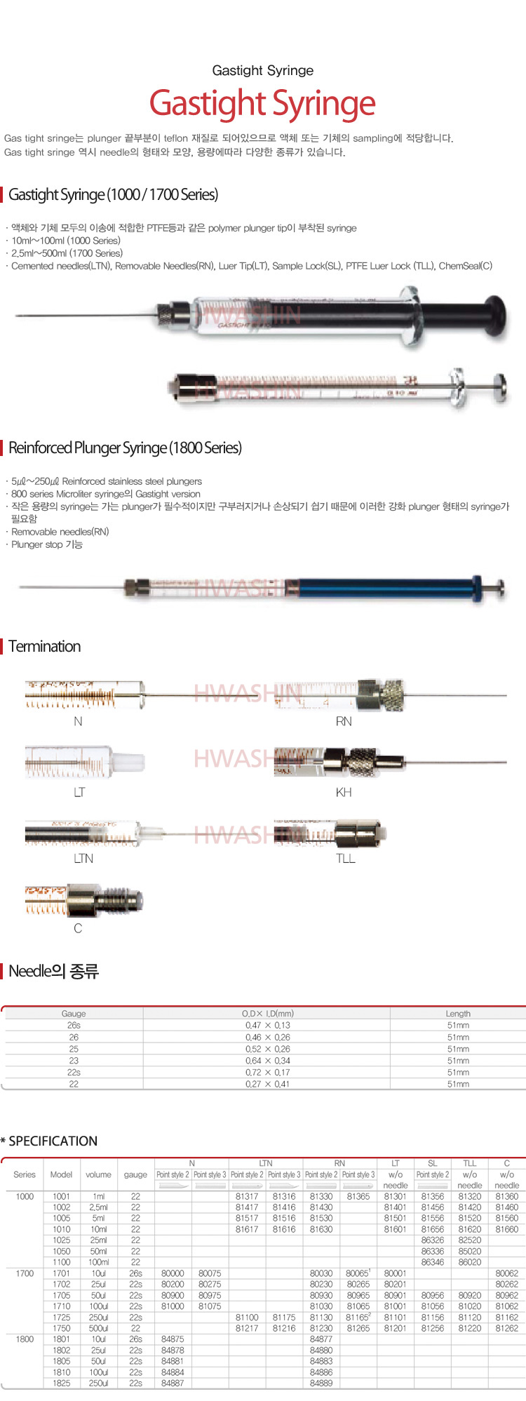 Gas tight sringe는 plunger 끝부분이 teflon 재질로 되어있으므로 액체 또는 기체의 sampling에 적당합니다. Gas tight sringe 역시 needle의 형태와 모양, 용량에따라 다양한 종류가 있습니다.