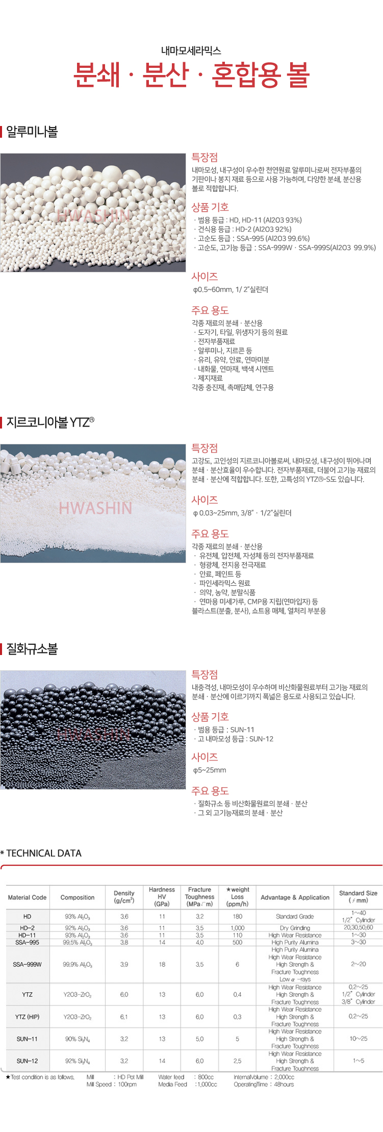 세라믹, 알루미나볼, 볼, 지르코니아볼, YTZ, 질화규소볼, SUN-11, SUN-12, 탄화규소, SiC-11, HD, HD-11, HD-2, HD-LU97, SSA-995, SSA-999W, SSA-999S