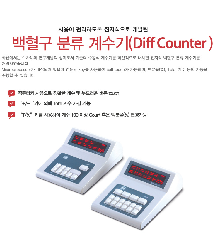 수차례의 연구개발의 성과로서 기존의 수동식 계수기를 혁신적으로 대체한 전자식 백혈구 분류 계수기를 개발하였습니다. Miicroprocessor가 내장되어 있으며 컴퓨터 key를 사용하여 soft touch가 가능하며, 백분율(%), Total 계수 등의 기능을 수행할 수 있습니다.