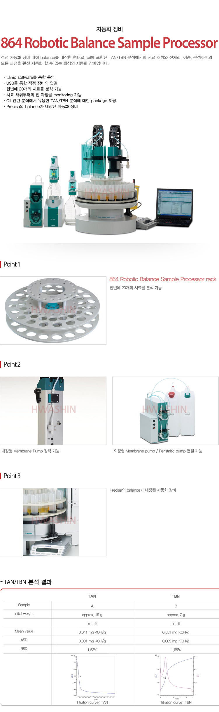 [전위차적정기] [Metrohm] 864 Robotic Balance Sample Processor 적정 자동화 장비 내에 balance를 내장한 형태로, oil에 포함된 TAN/TBN 분석에서의 시료 채취와 전처리, 이송, 분석까지의 모든 과정을 완전 자동화 할 수 있는 최상의 자동화 장비입니다. 카달로그 및 제품 문의는 아래 메일로 연락을 주시기 바랍니다. 고객센터 : 1644-2519 info@hwashinbs.com 이전글 [Metrohm] 800 Dosinge unit 다음글 [Metrohm] 806 Exchange unit 검색 목록 본문 이전글 [Metrohm] 800 Dosinge unit 다음글 [Metrohm] 806 Exchange unit 검색 목록