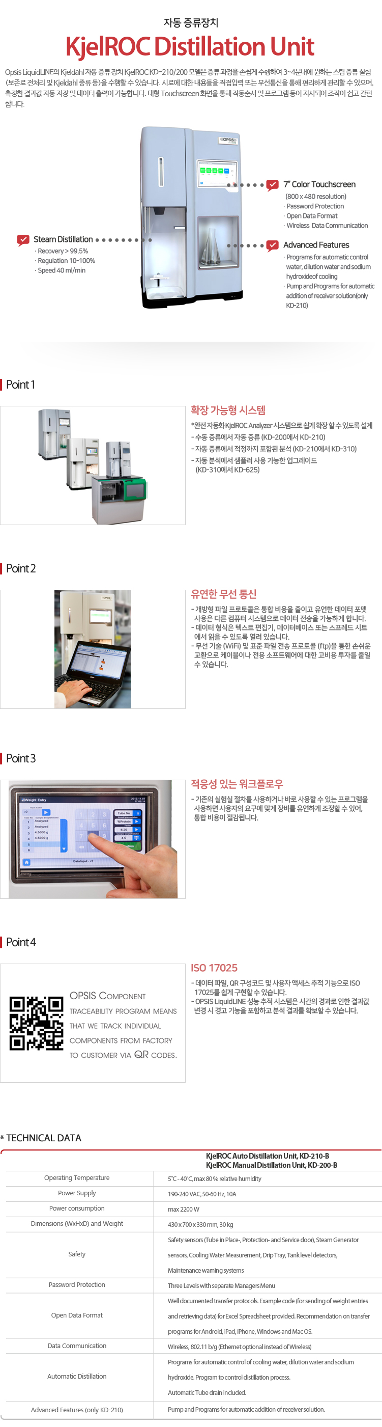 Opsis사의 Kjeldahl 자동 증류 장치 KjelROC KD-210/200 모델은 증류 과정을 손쉽게 자동으로 수행하여 3~4 분내에 시료의 스팀증류를 완성해줍니다.