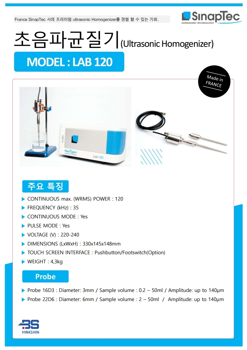 [초음파파쇄기] LAB120 FOR AXIAL PROBES France SinapTec 사의 프리미엄 ultrasonic Homogenizer를 경험 할 수 있는 기회. 메이커 : SiLabTec 카달로그 및 제품 문의는 아래 메일로 연락을 주시기 바랍니다. 고객센터 : 1644-2519 info@hwashinbs.com 다음글 LAB750 FOR AXIAL PROBES 검색 목록 본문 다음글 LAB750 FOR AXIAL PROBES 검색 목록