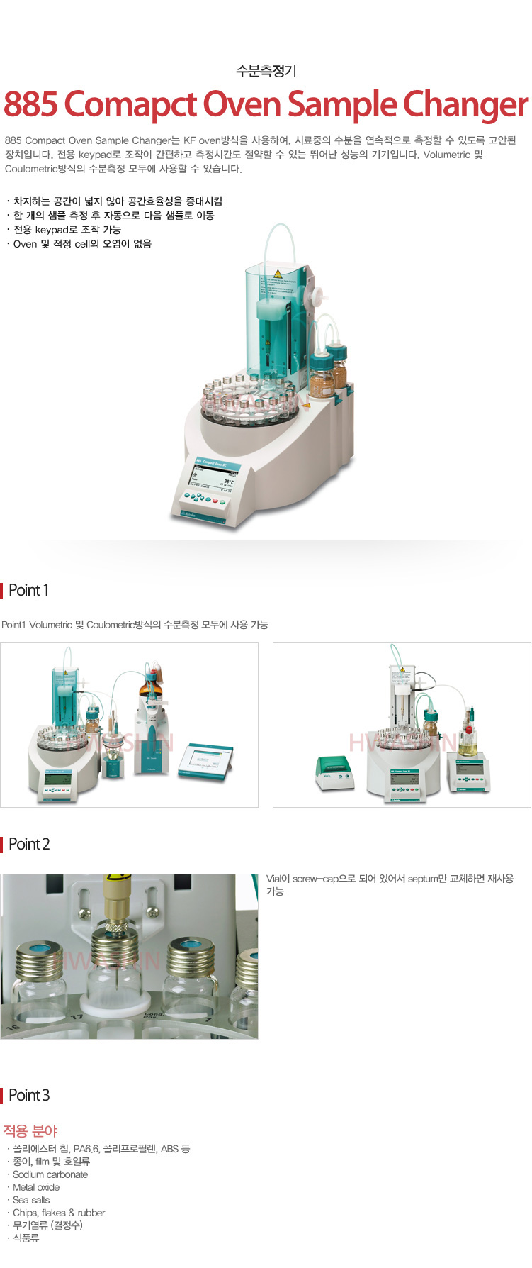[KF 수분측정기] [Metrhom] 885 Comapct Oven Sample Changer 885 Compact Oven Sample Changer는 KF oven방식을 사용하여, 17개의 시료의 수분을 연속적으로 측정할 수 있도록 고안된 장치입니다. 카달로그 및 제품 문의는 아래 메일로 연락을 주시기 바랍니다. 고객센터 : 1644-2519 info@hwashinbs.com 이전글 [Metrhom] 860 KF Thermoprep 다음글 [Metrhom] 874 USB Oven Sample Processor 검색 목록 본문 이전글 [Metrhom] 860 KF Thermoprep 다음글 [Metrhom] 874 USB Oven Sample Processor 검색 목록