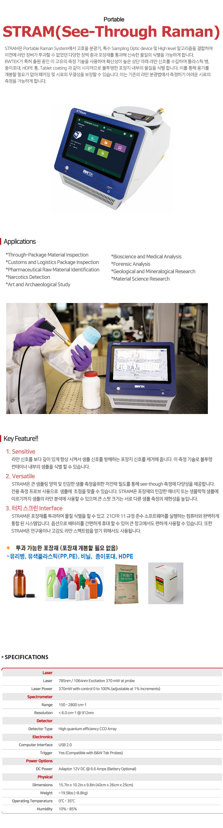 STRAM은 Portable Raman System에서 고효율 분광기, 특수 Sampling Optic device 및 High level 알고리즘을 결합하여 이전에 라만 장비가 투과할 수 없었던 다양한 장벽 층과 포장재를 통과해 신속한 물질의 식별을 가능하게 합니다.