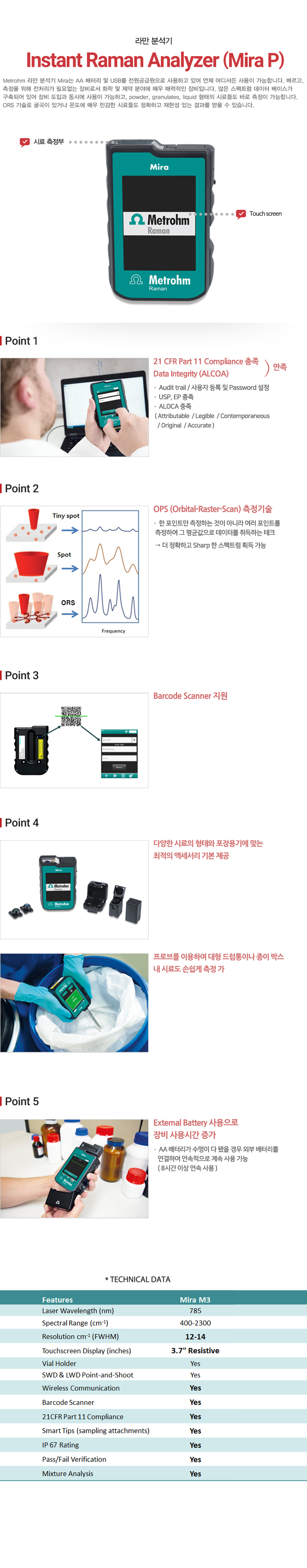 [NIR & Raman] [Metrohm] Mira P(Instant Raman Analyzer) Metrohm 라만 분석기 Mira는 AA 배터리 및 USB를 전원공급원으로 사용하고 있어 언제 어디서든 사용이 가능합니다. 메이커 : Metrohm 카달로그 및 제품 문의는 아래 메일로 연락을 주시기 바랍니다. 고객센터 : 1644-2519 info@hwashinbs.com 이전글 [Metrohm] NIR Systems 다음글 [Metrohm] MISA(Surface Enhanced Raman Scattering) 검색 목록 본문 이전글 [Metrohm] NIR Systems 다음글 [Metrohm] MISA(Surface Enhanced Raman Scattering) 검색 목록